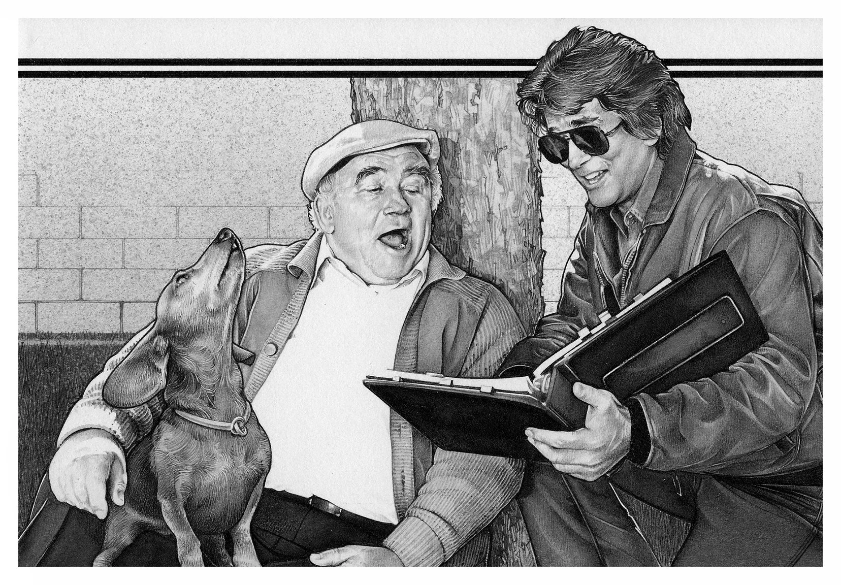 Coincidentally, at the time I did this drawing I happened to live directly across the street from Ed. I asked him to come by so I could take a photo of him to use as my reference, and I had my own dog Shaboom sit on his lap. Of course it was impossible to get my pup to howl on command so I had an assistant hold a treat above his head (tricks of the trade).