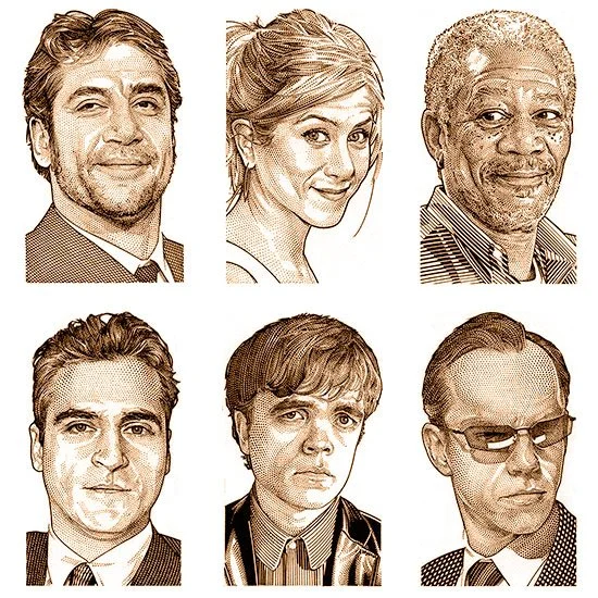 Perhaps best known commercially as a portrait artist, Randy has an exceptional aptitude for capturing his subject’s character and essence with carefully nuanced precision. This, combined with his stippling expertise, made him a perfect match for the Wall Street Journal’s iconic portraits known as “hedcuts”; he’s created several hundred of them since 1998.